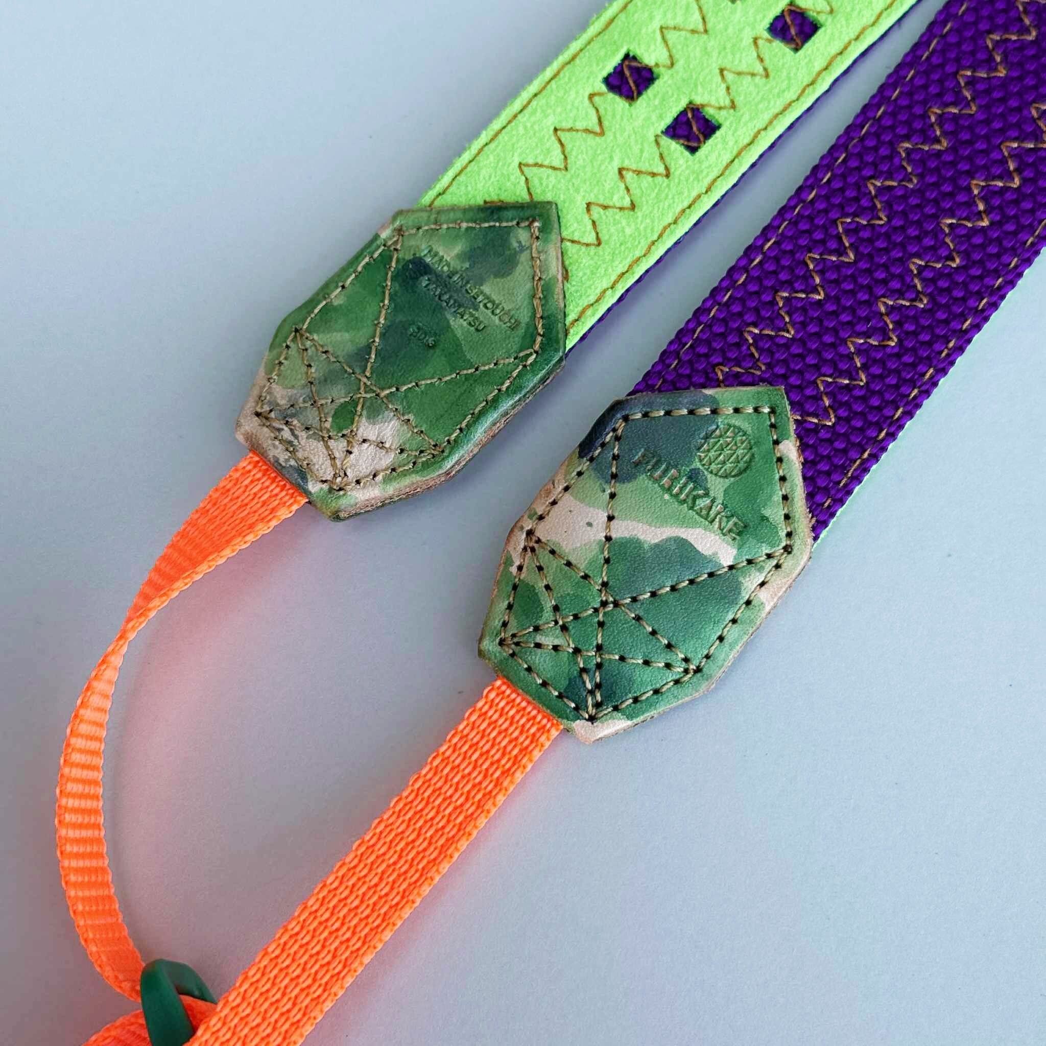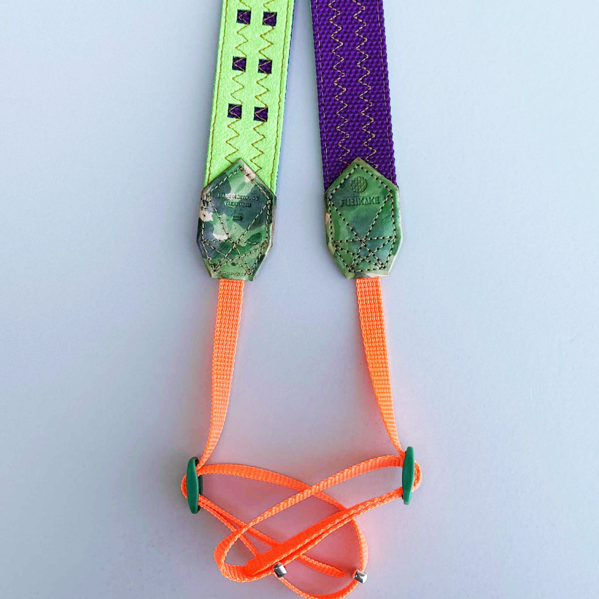 30mm幅カメラストラップパープル裏地蛍光グリーン革ムラ染