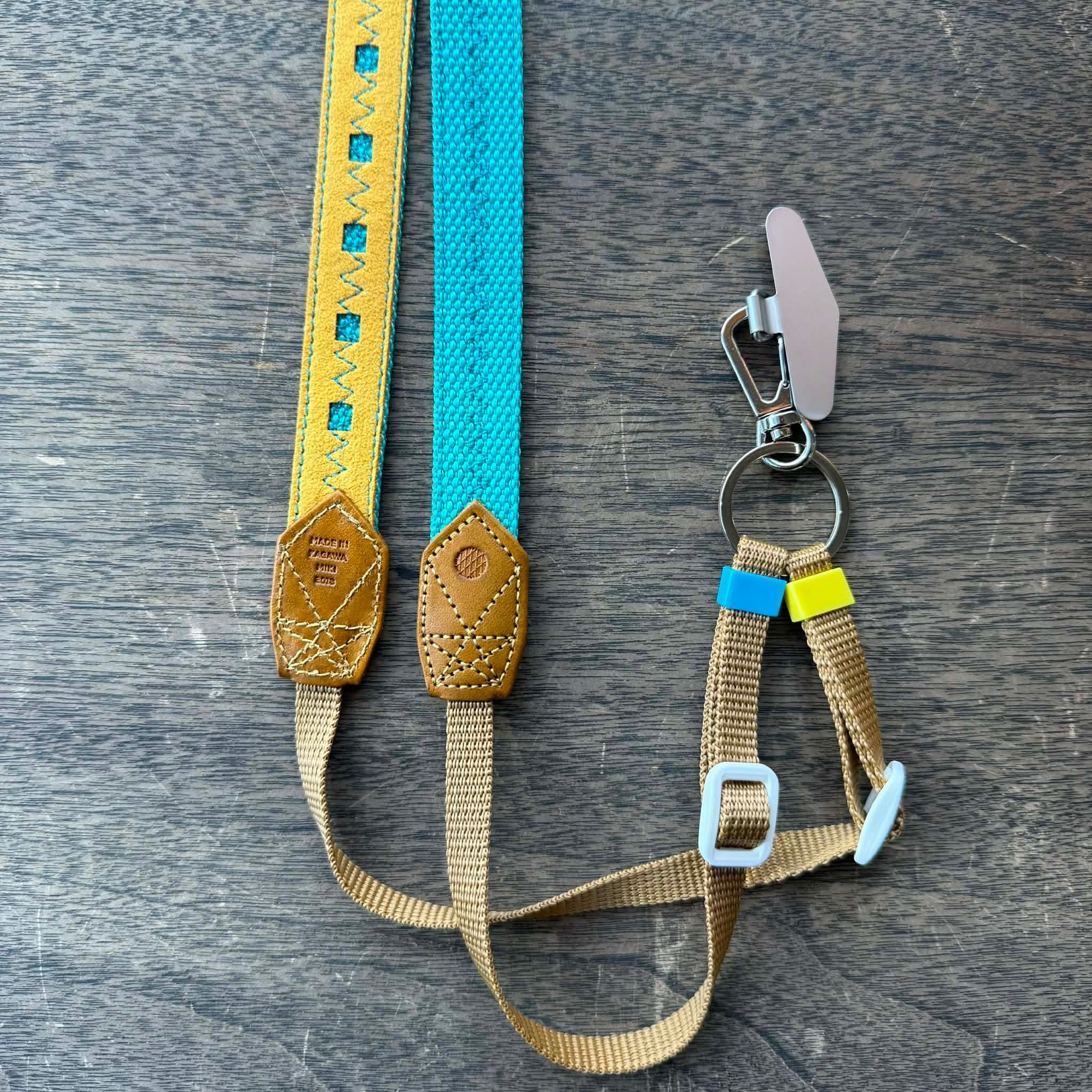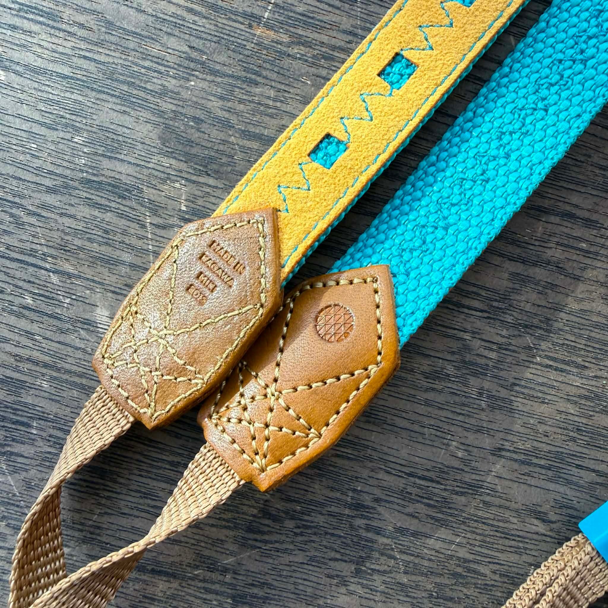 20mmカメラストラップ(スマホ金具つき)カリブブルー裏地イエロー革セトウチレザーキャメル