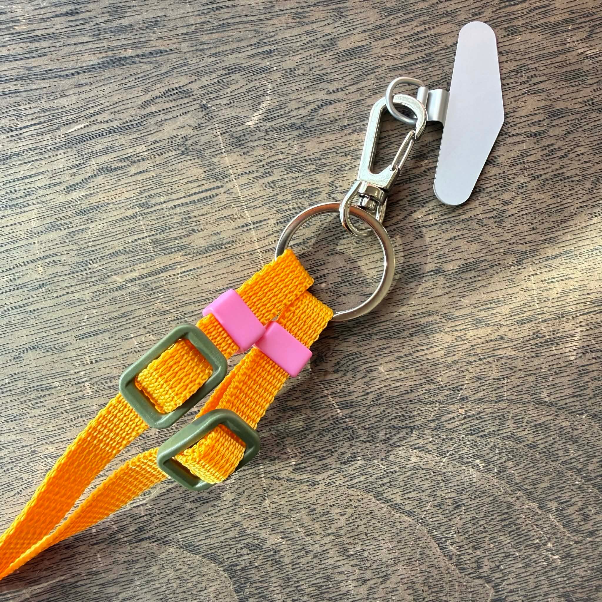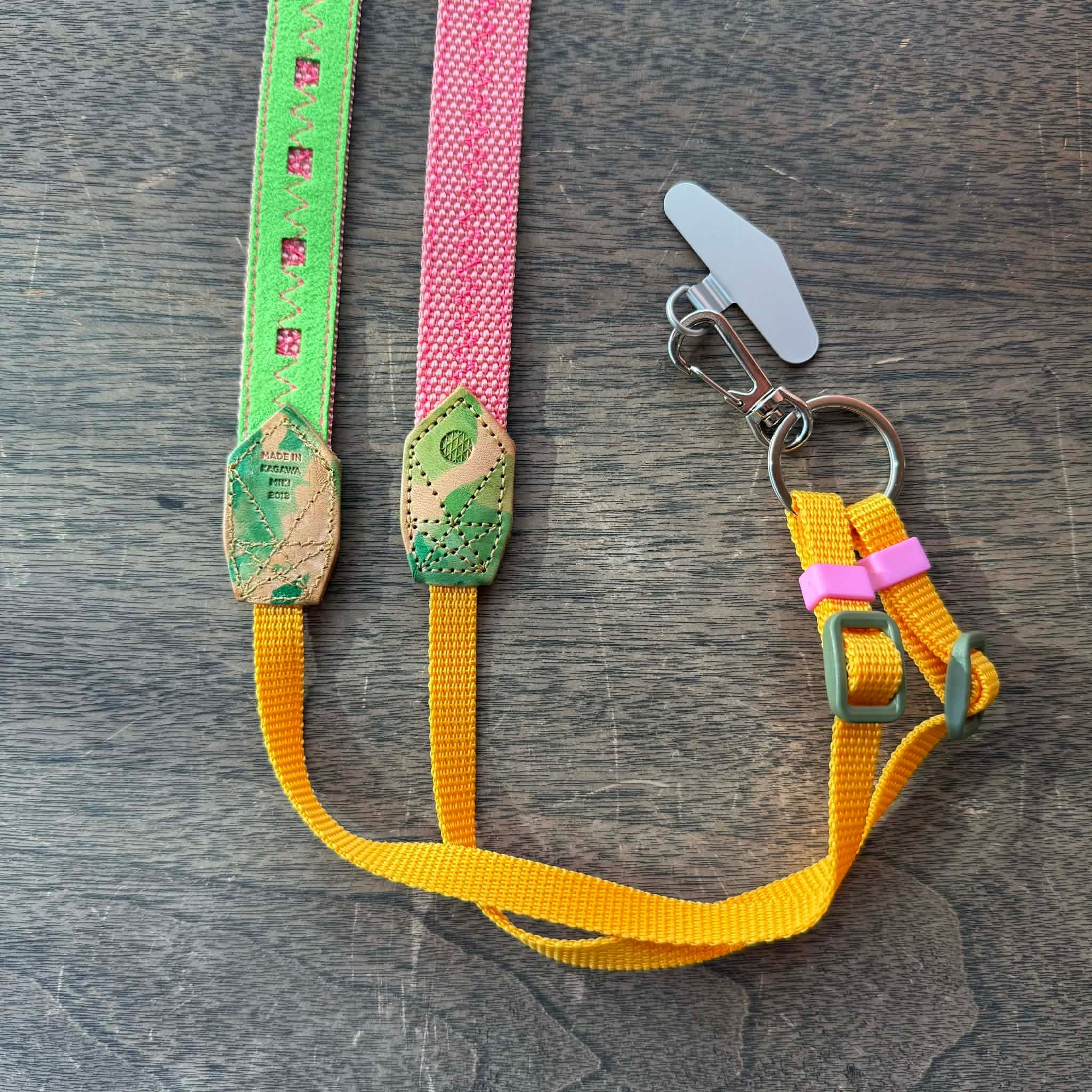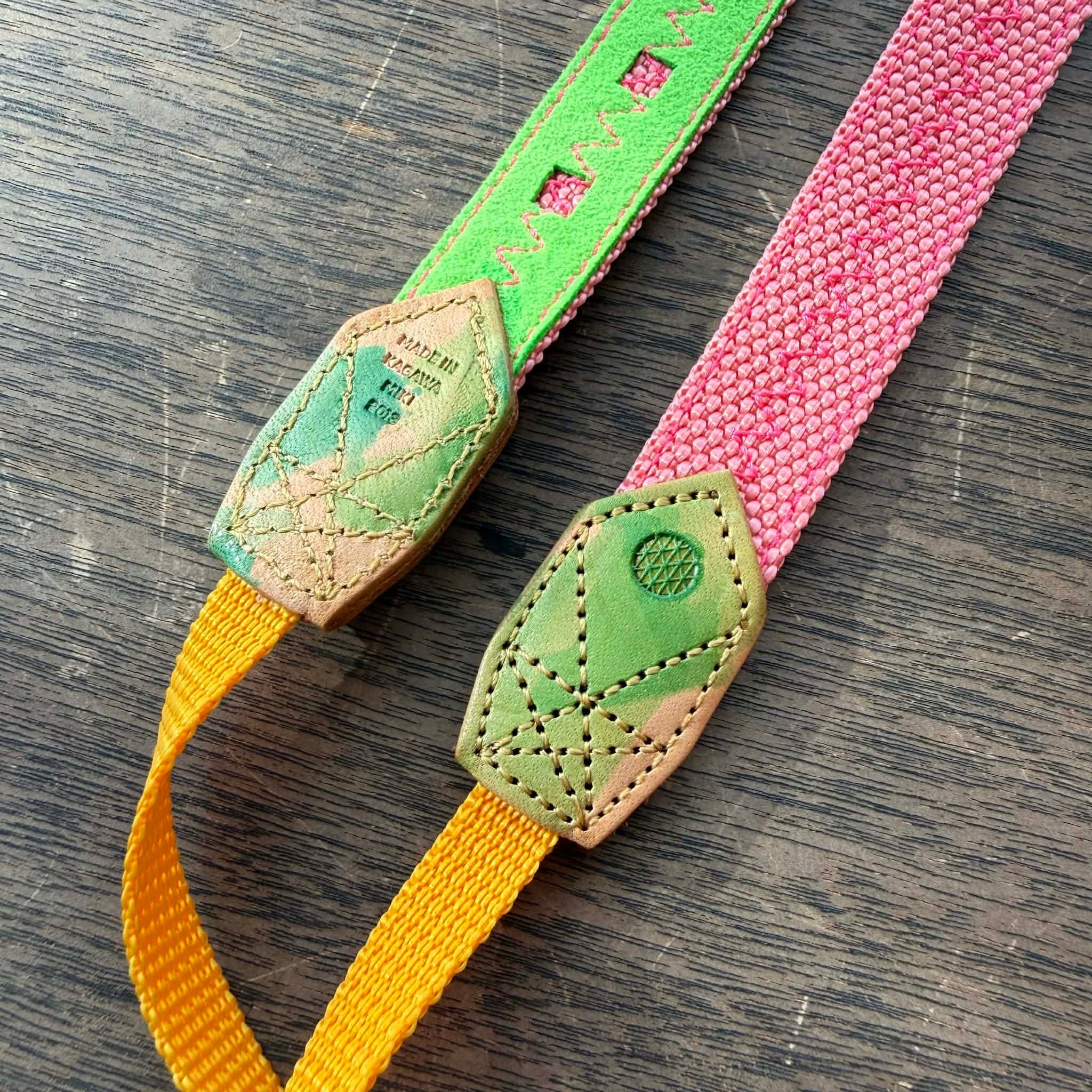 20mmカメラストラップ(スマホ金具つき)サーモンピンク裏地蛍光グリーン革ムラ染め