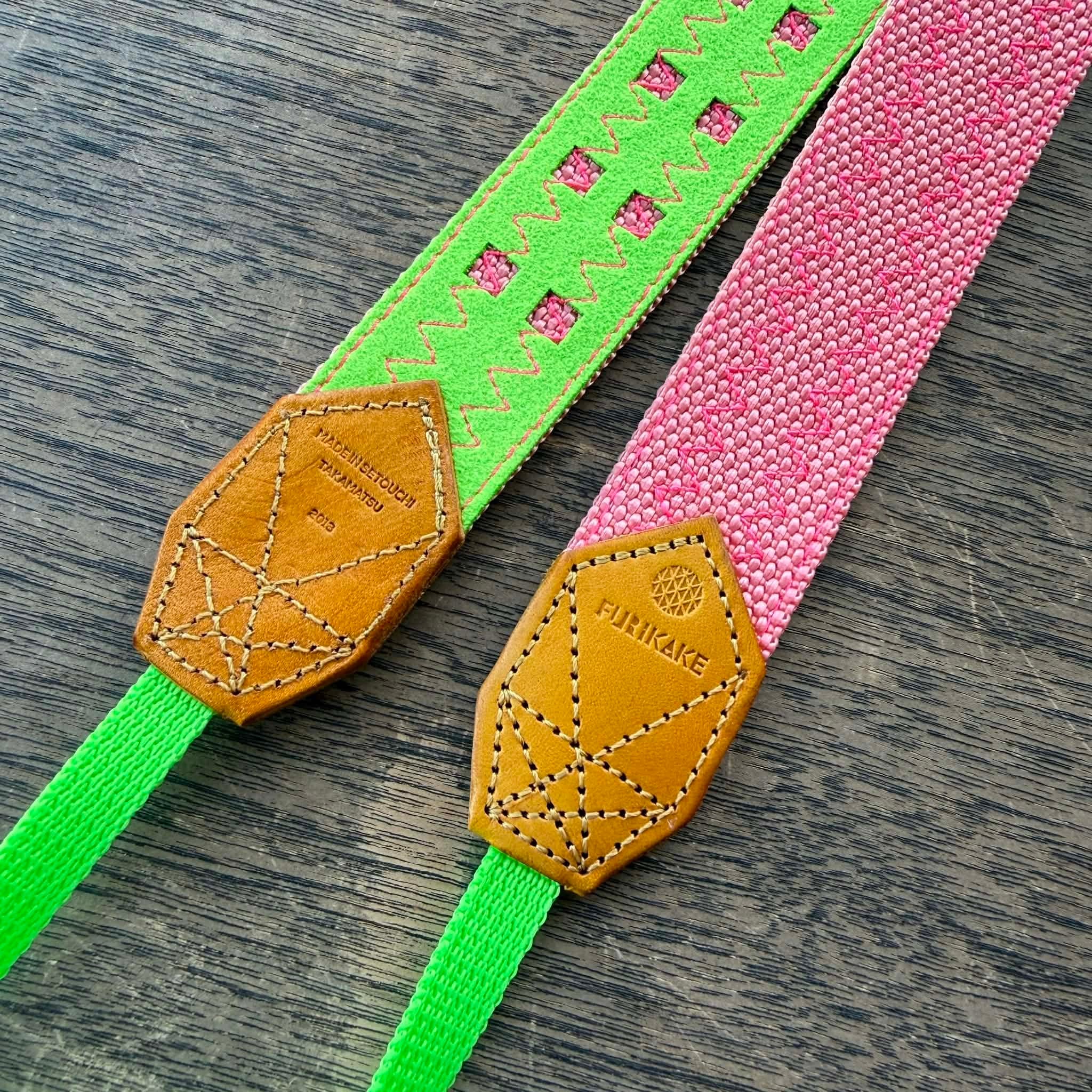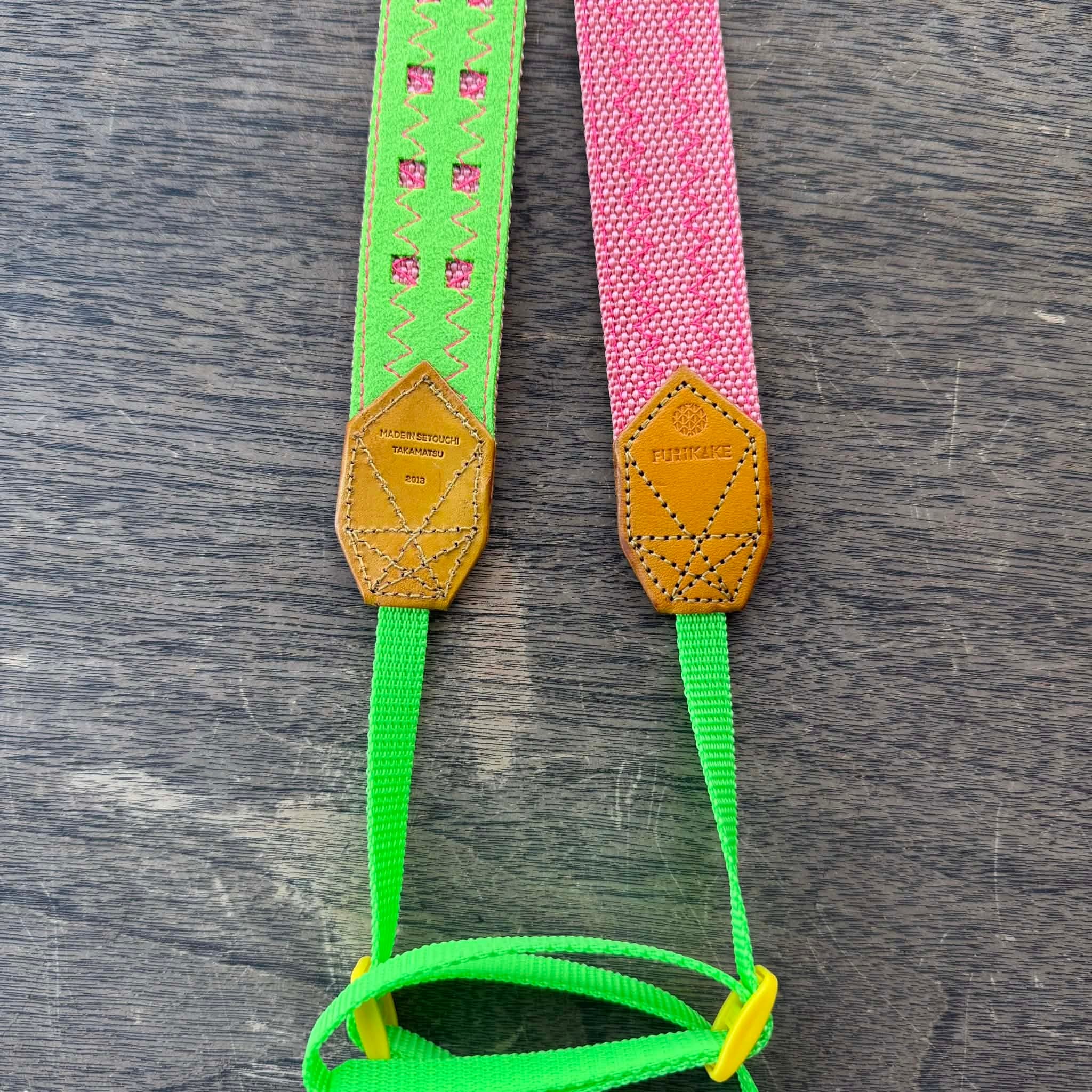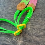 30mm幅カメラストラップサーモンピンク裏地蛍光グルーん革ベタ染黄色