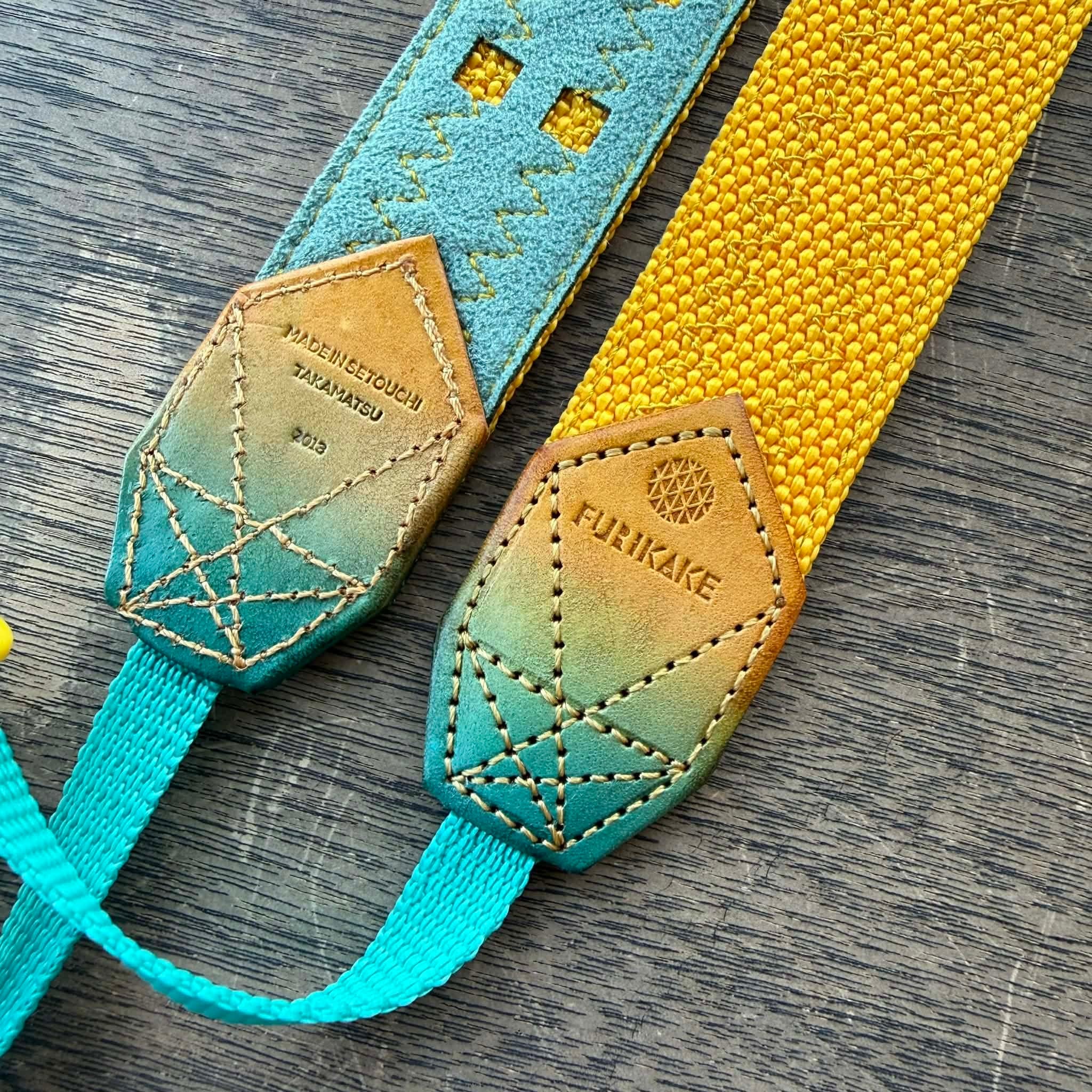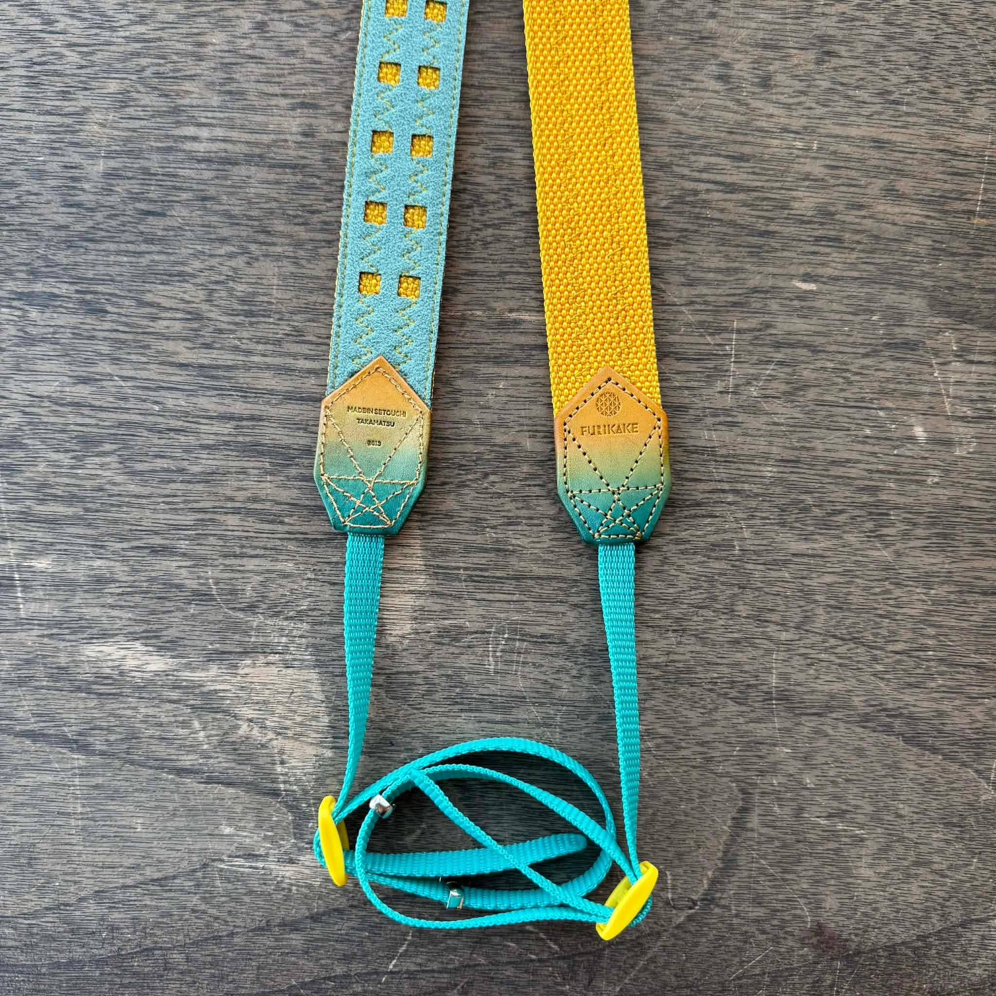 30mm幅カメラストラップイエロー裏地山藍ずり革グラデーション染