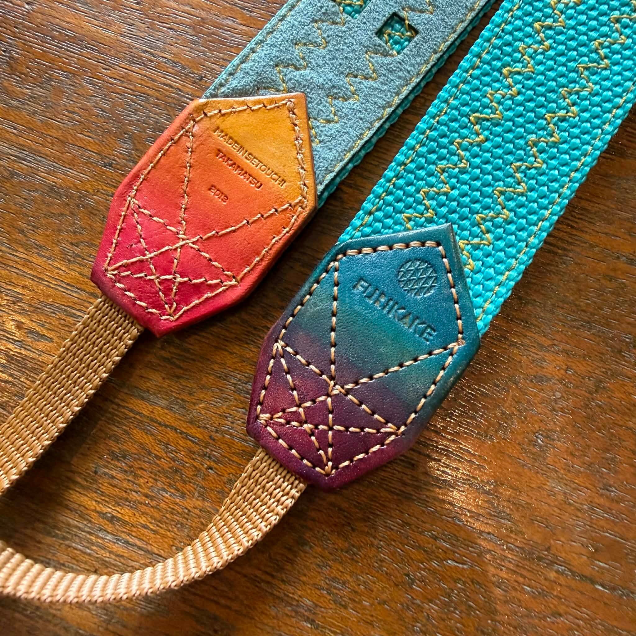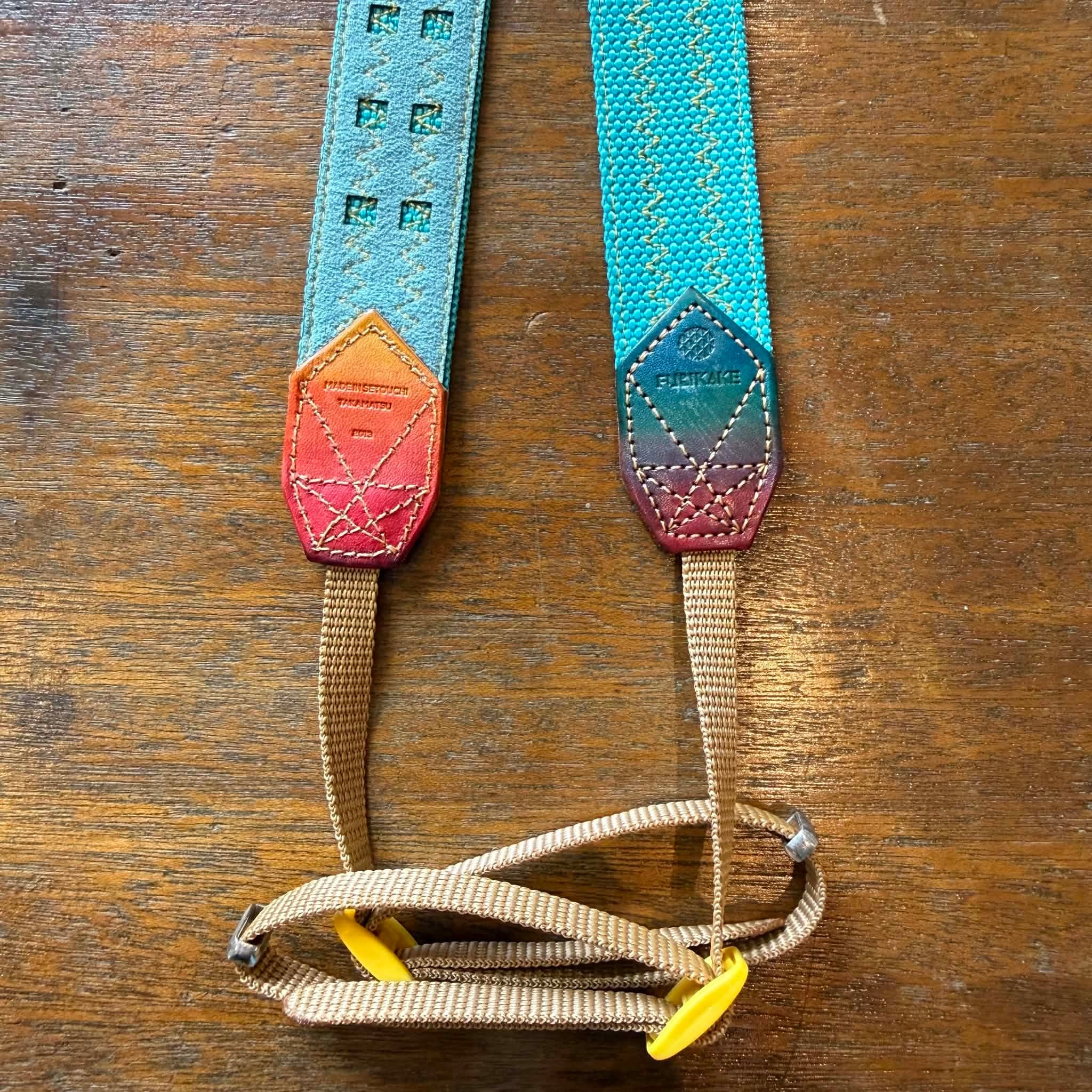 30mm幅カメラストラップカリブブルー裏地山藍ずり革グラデ染