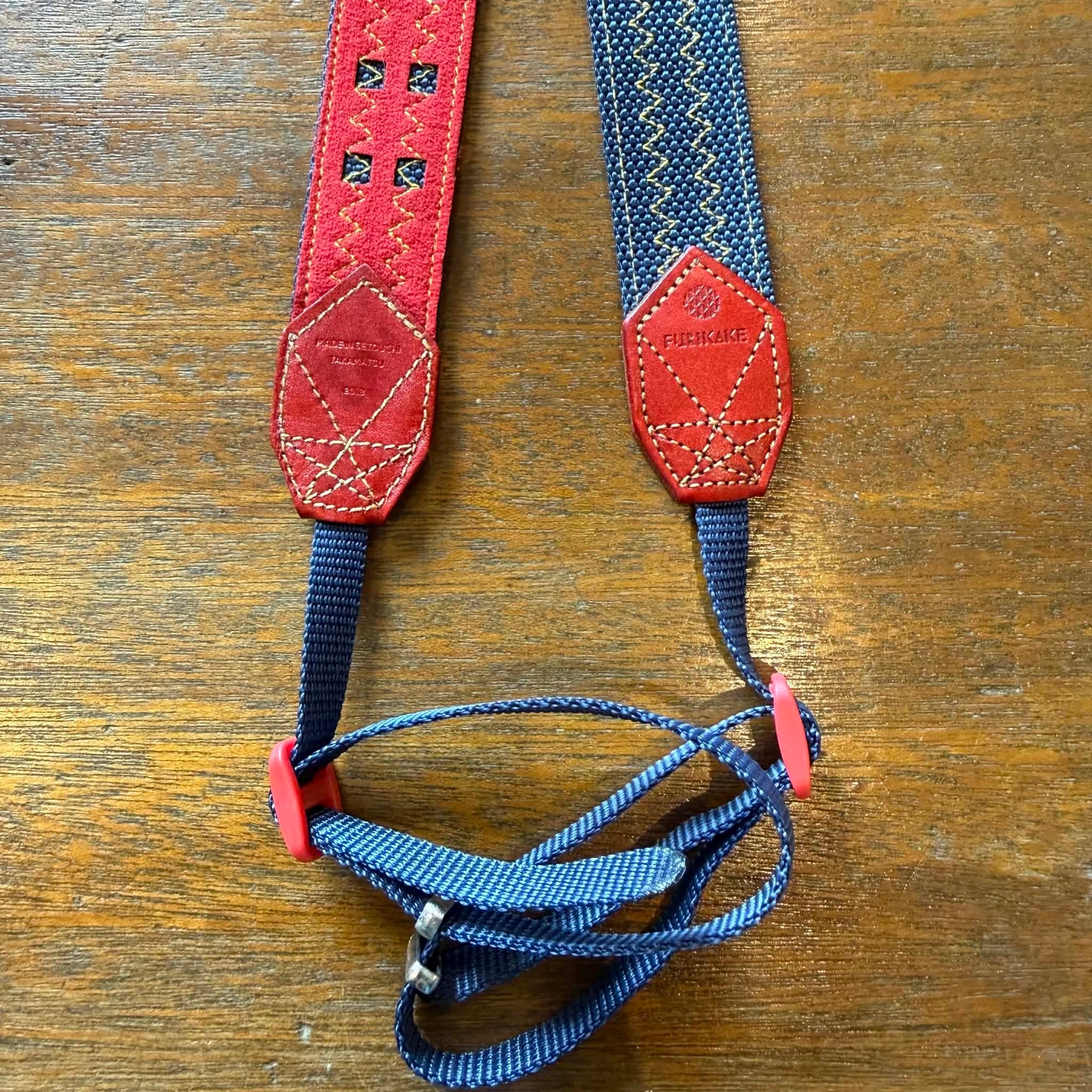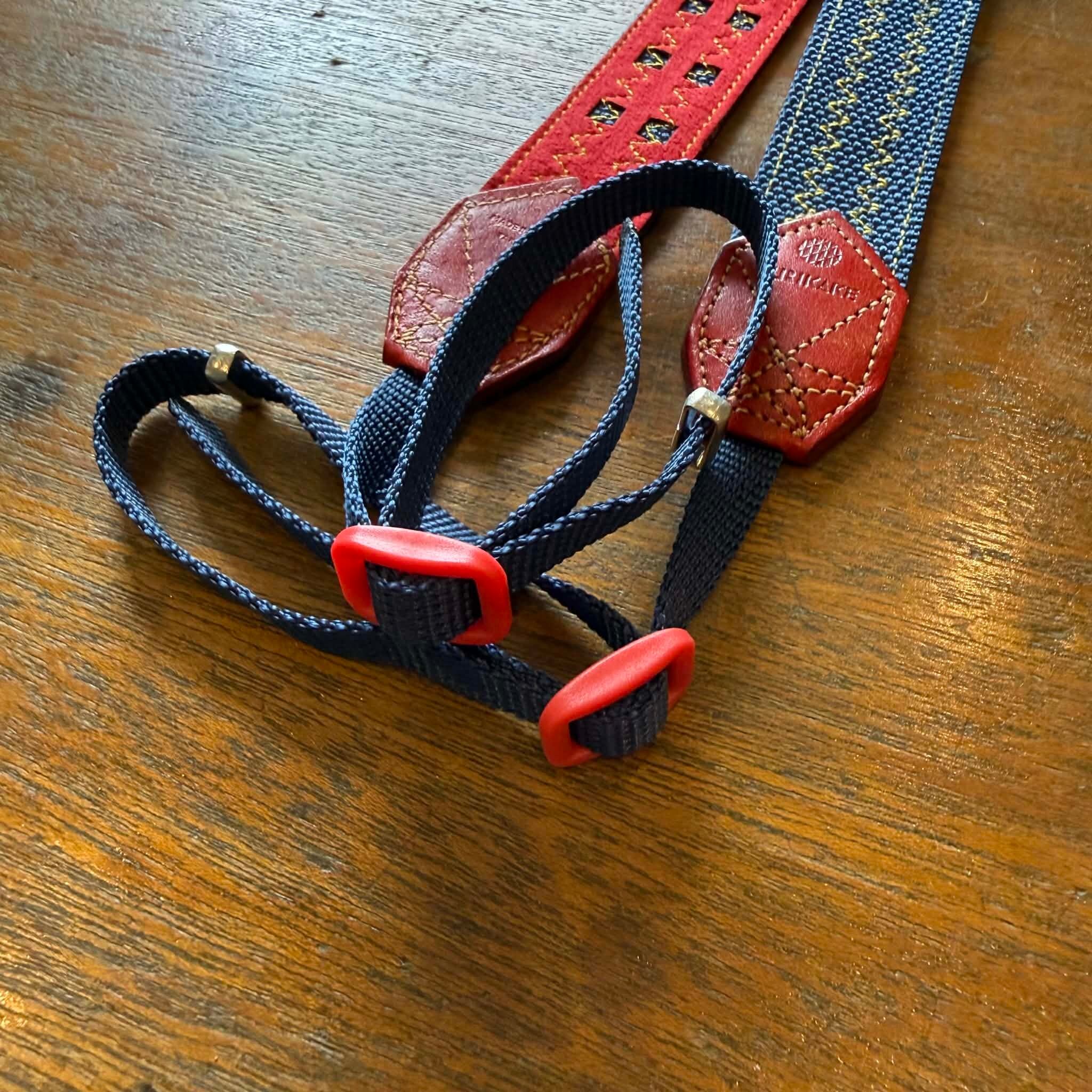 30mm幅カメラストラップネイビー裏地赤革セトウチレザー赤