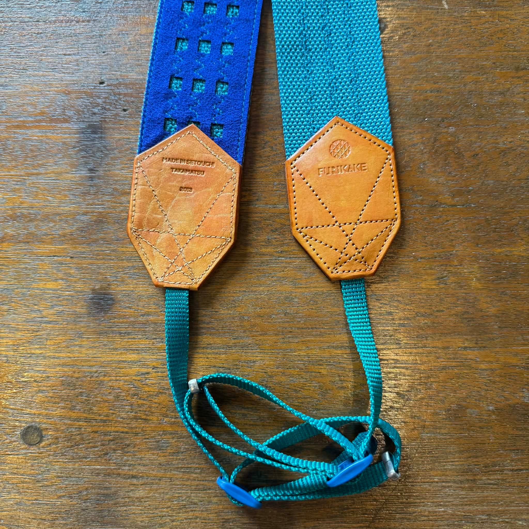 50mm幅カメラストラップターコイズブルー裏地ロイヤルブルー革ムラ染